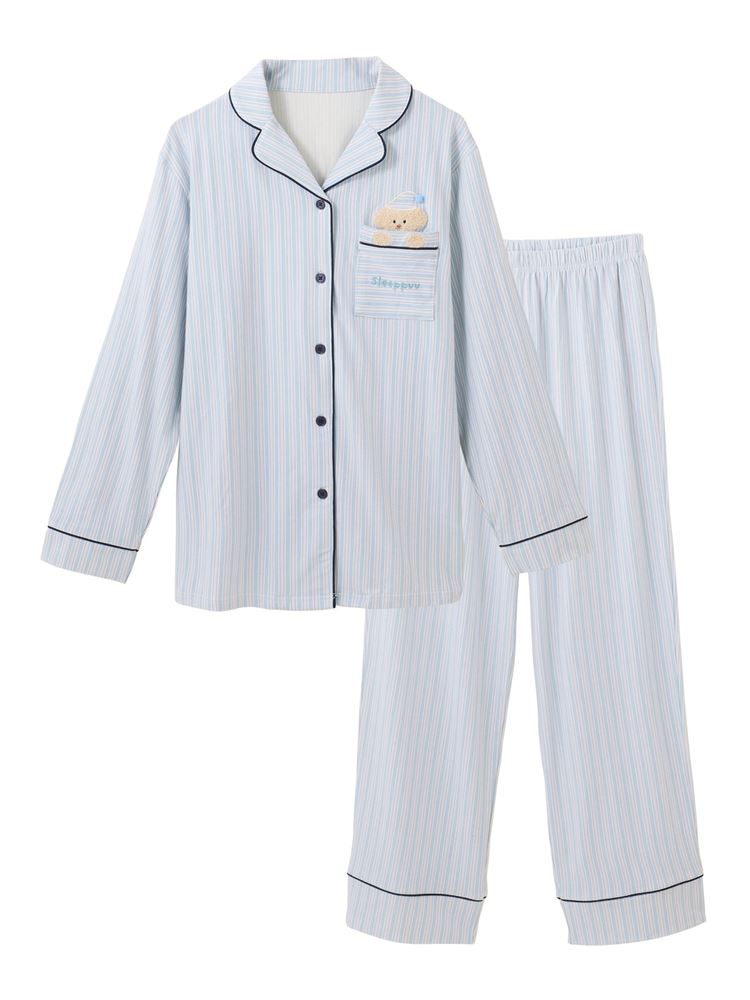淡い色合いのマルチカラーストライプにパイピングをあしらった、やさしい印象の前開きパジャマ。