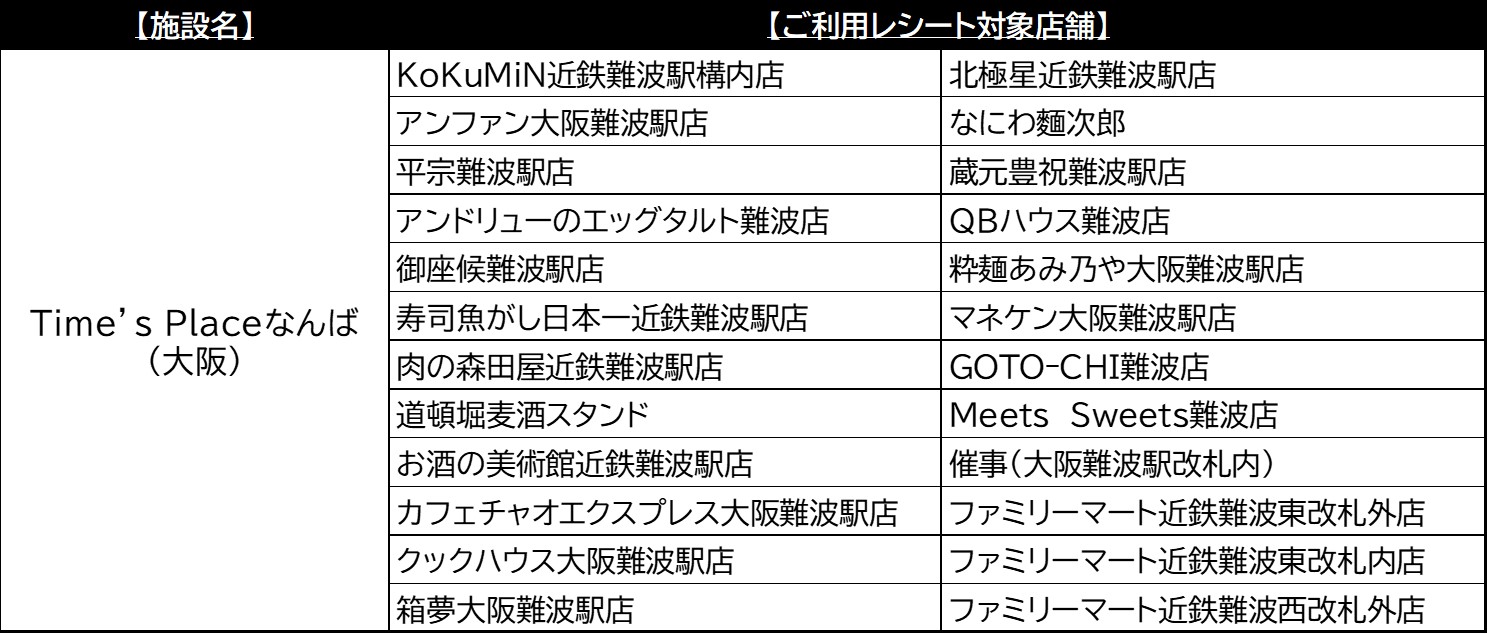 ▼タイムズプレイス難波各店のご利用レシート対象店舗はこちら▼
