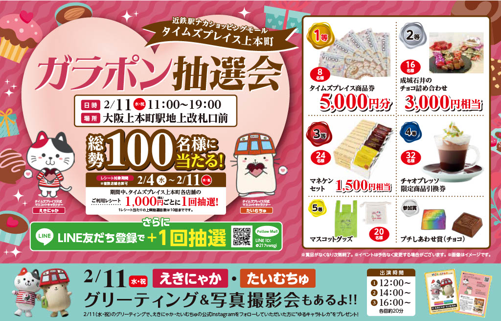 タイムズプレイス上本町・西大寺の2施設でバレンタイン抽選会を実施いたします。