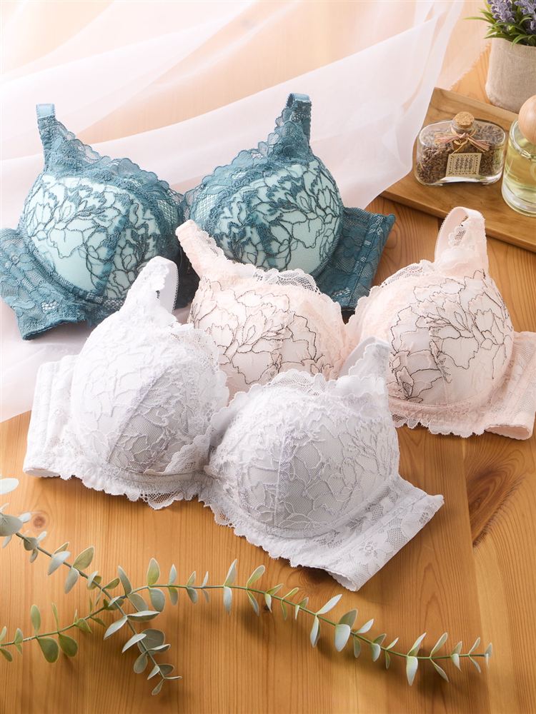 ・前中心でレースを重ねた「カシュクール仕様」とカップ内側のパネルで、お胸をサイドから中心にしっかり寄せ、横広がりを防止。
