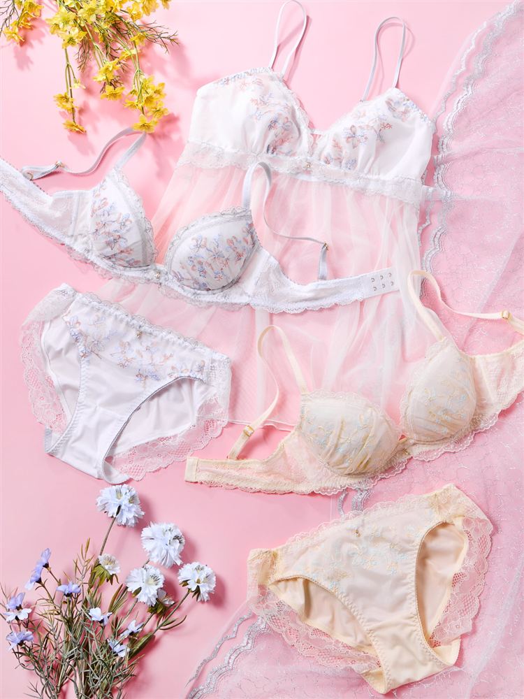 カップを縁取る部分にあしらった はしごレースの刺繍が、甘さの中にも上品さを感じさせる印象に。