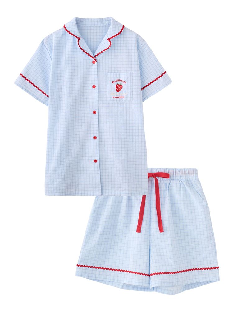 品名 綿100%グラフチェック柄フルーツ刺繍サッカー半袖パジャマ